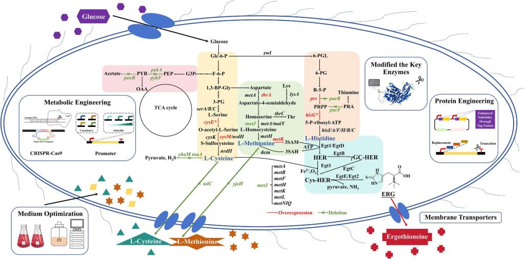 在底盘细胞构建方面,研究团队系统总结了以大肠杆菌、酵母、谷氨酸棒状杆菌等为宿主的代谢工程策略,包括关键酶表达优化、前体供应增强、竞争路径敲除、蛋白工程改造等手段,显著提升了麦角硫因的产量与合成效率。例如,通过在大肠杆菌中引入真菌来源的Egt1和Egt2基因,并结合前体代谢路径优化,已实现5.4 g/L的麦角硫因产量。