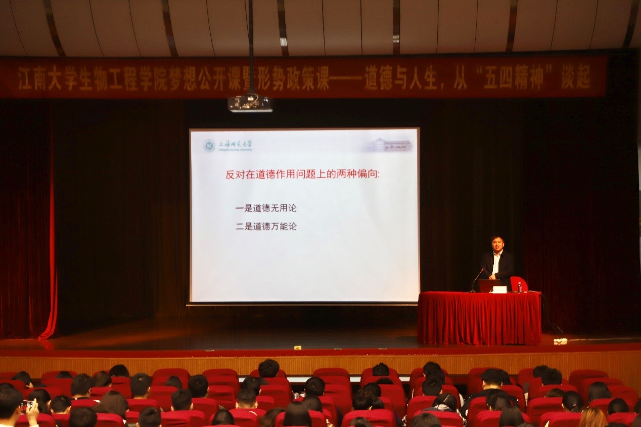 为传承和弘扬五四精神,纪念五四运动100周年,4月26日下午,生物工程学院梦想公开课暨形势政策课在南活报告厅成功举办。上海师范大学马克思主义学院院长、中国社会科学院国家文化安全与意识形态建设研究中心特邀研究员张志丹教授应邀担任主讲嘉宾,以“道德与人生,从‘五四精神’谈起”为主题作了一场精彩的讲座。生物工程学院党委副书记、副院长陈勇老师,分团委书记葛玲老师以及生工学院的本、硕、博学生参加了讲座。
