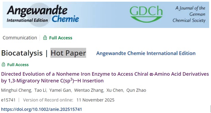 近期,我校生物工程学院赵群教授团队成功将非天然的氮宾迁移反应机制引入金属酶催化体系,实现了酶促法合成手性非天然氨基酸,研究成果以“Directed Evolution of a Nonheme Iron Enzyme to Access Chiral α-Amino Acid Derivatives by 1,3-Migratory Nitrene C(sp3)─H Insertion为题正式发表于Angewandte Chemie International Edition(IF = 17),该工作入选Angewandte当期的 “Hot Paper”。