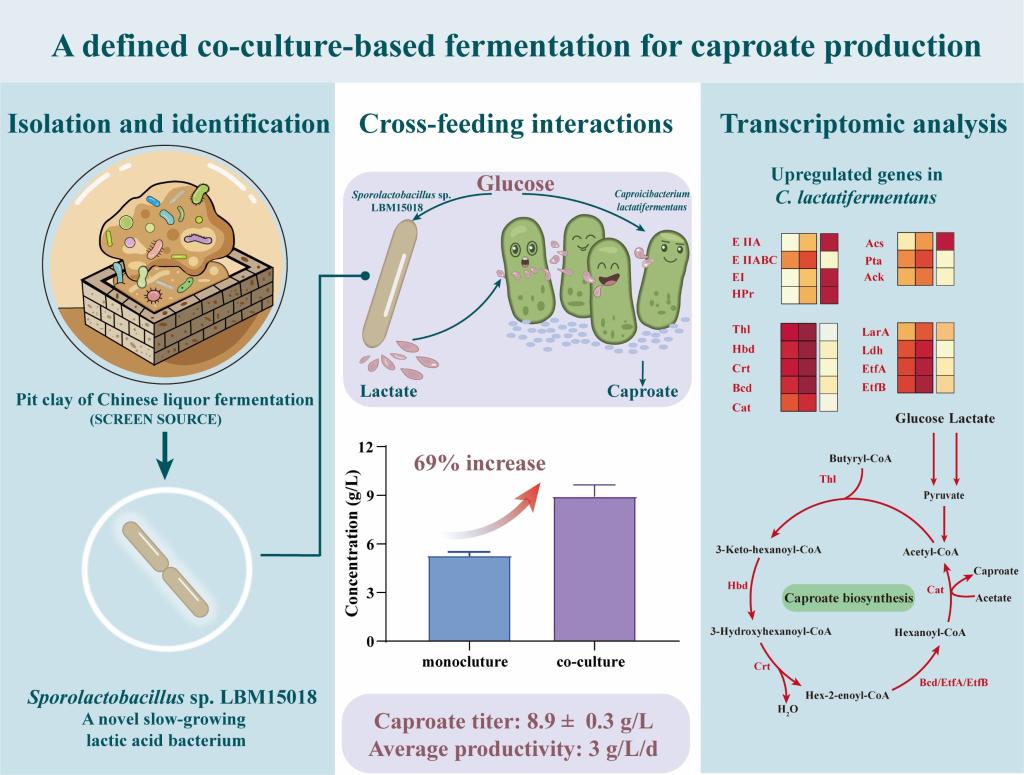 转录组学分析进一步揭示,共培养条件下解乳酸己小杆菌的葡萄糖与乳酸利用相关基因显著上调,逆β-氧化途径关键基因表达增强,同时中心代谢途径呈现整体下调,体现了该菌在双菌发酵体系中的“生长-存活”代谢重编程特性。而对于乳酸菌Sporolactobacillus sp. LBM15018而言,其糖摄取和乳酸合成相关基因受到抑制,应激响应基因显著上调,表明该菌在共培养中进入了胁迫适应状态。这种不对称的代谢相互作用关系,既维持了共培养系统中乳酸的稳定供给,又避免了培养基的过度酸化,从而实现了高效的己酸合成。相比传统单一菌株发酵策略,本研究构建的双菌共培养体系突破了单一菌株在碳源利用与代谢调控方面的限制,实现了“糖→乳酸→己酸”的级联转化。