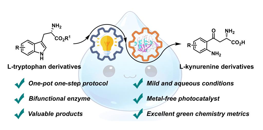 近期,我校生物工程学院饶义剑教授团队在光/酶协同催化合成L-犬尿氨酸及其衍生物方面取得重要进展,研究成果“Bioinspired photoenzymatic cascade enabled by a bifunctional arylformamidase for efficient synthesis of L-kynurenine derivatives”正式发表于Green Chemistry (IF = 9.2) (https://doi.org/10.1039/D6GC00950F)。