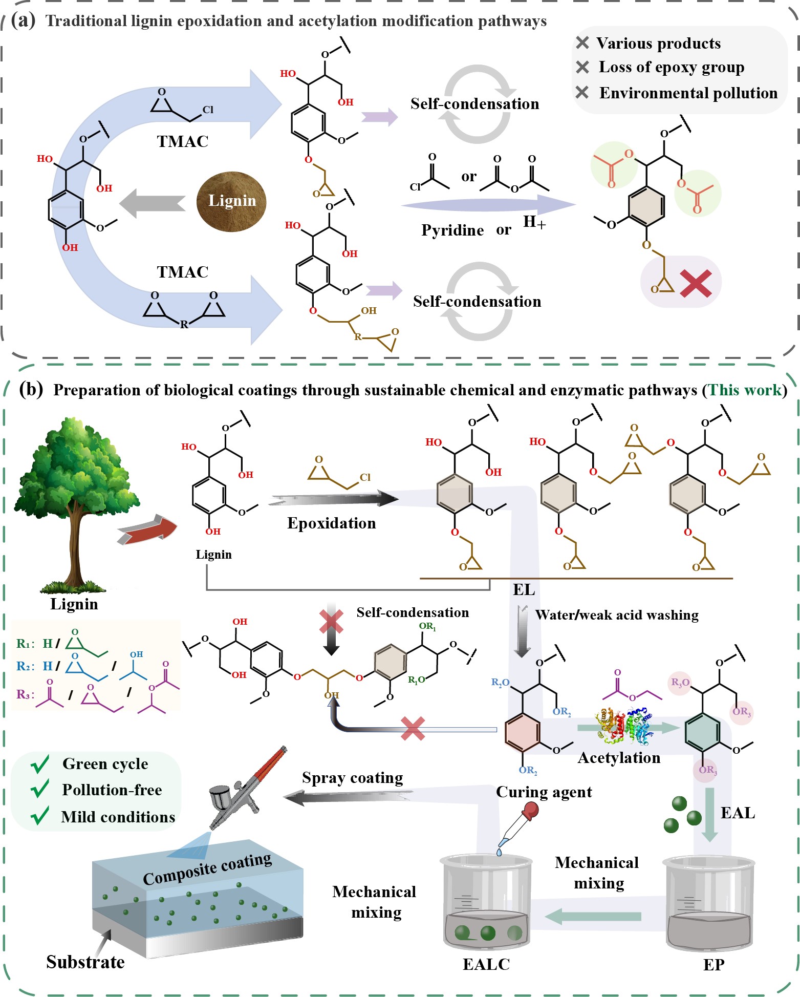 随着不可再生资源的枯竭,可持续绿色材料成为研究热点,而富含芳香环的木质素作为乙醇生产、造纸等工业的大量副产物,虽储量丰富、可再生,却长期因结构复杂、分散性差等问题被当作废弃物,既浪费资源又污染环境。同时,传统工业涂层大多依赖石油基原料,存在污染严重、性能单一等问题,而木质素基环氧涂层虽能替代石油原料、增强力学性能,但实际应用中易出现预聚体团聚问题,原因是碱性条件下木质素中脂肪族羟基和羧基转化不完全,残留羟基引发亲水团聚、自缩聚及过早交联,阻碍其在有机介质中均匀分散,传统洗涤过程还会导致环氧基开环、羟基重新暴露。传统乙酰化改性虽能改善分散性,却会破坏环氧基功能,无法满足严苛场景需求。