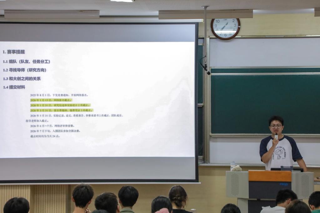 为深入推进2025-2026学年学院学科竞赛工作,进一步强化“以赛促教、以赛促学、以赛促创”育人实效,充分发挥学科竞赛在人才培养中的关键作用,生物工程学院于9月29日在1B103教室举办“创生未来”创新创业训练营学科竞赛经验分享会暨第十一届全国大学生生命科学竞赛启动仪式。学院学科竞赛分管辅导员周杰、第十届全国大学生生命科学竞赛获奖学生代表及学院本科生共200余人参加本次活动。
