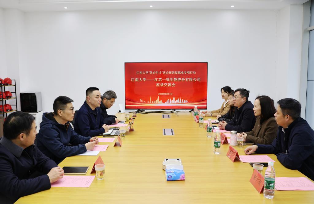 3月31日下午,江南大学党委常委、副校长刘龙率队赴江苏一鸣生物股份有限公司开展“优企引才”访企拓岗活动。生物工程学院党委书记程捷音,党委副书记、副院长林丹,副院长陈旭升,助理研究员王靓及毕业班辅导员、学生代表一同参加。江苏一鸣生物股份有限公司董事长史知萌、生产总监卢雪峰、董事长秘书石林、财务总监蒋铭、人事总监黄金等出席活动。